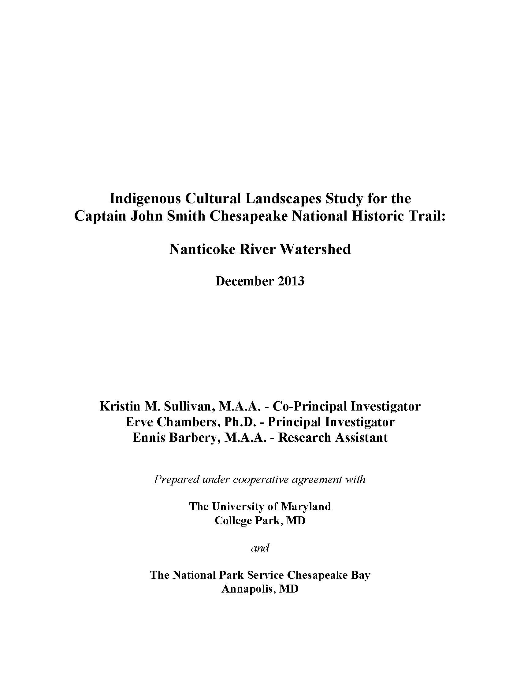 The Nanticoke River watershed was the first to undergo an Indigenous Cultural Landscape study, which was completed in 2013 in collaboration with The University of Maryland. The authors worked closely with members of the Native American community, including Chief Sewell Fitzhugh of the Nause-Waiwash Band of Indians, Chief William Daisey of the Nanticoke Indian Tribe, and Chief Dennis Coker of the Lenape Indian Tribe of Delaware.
